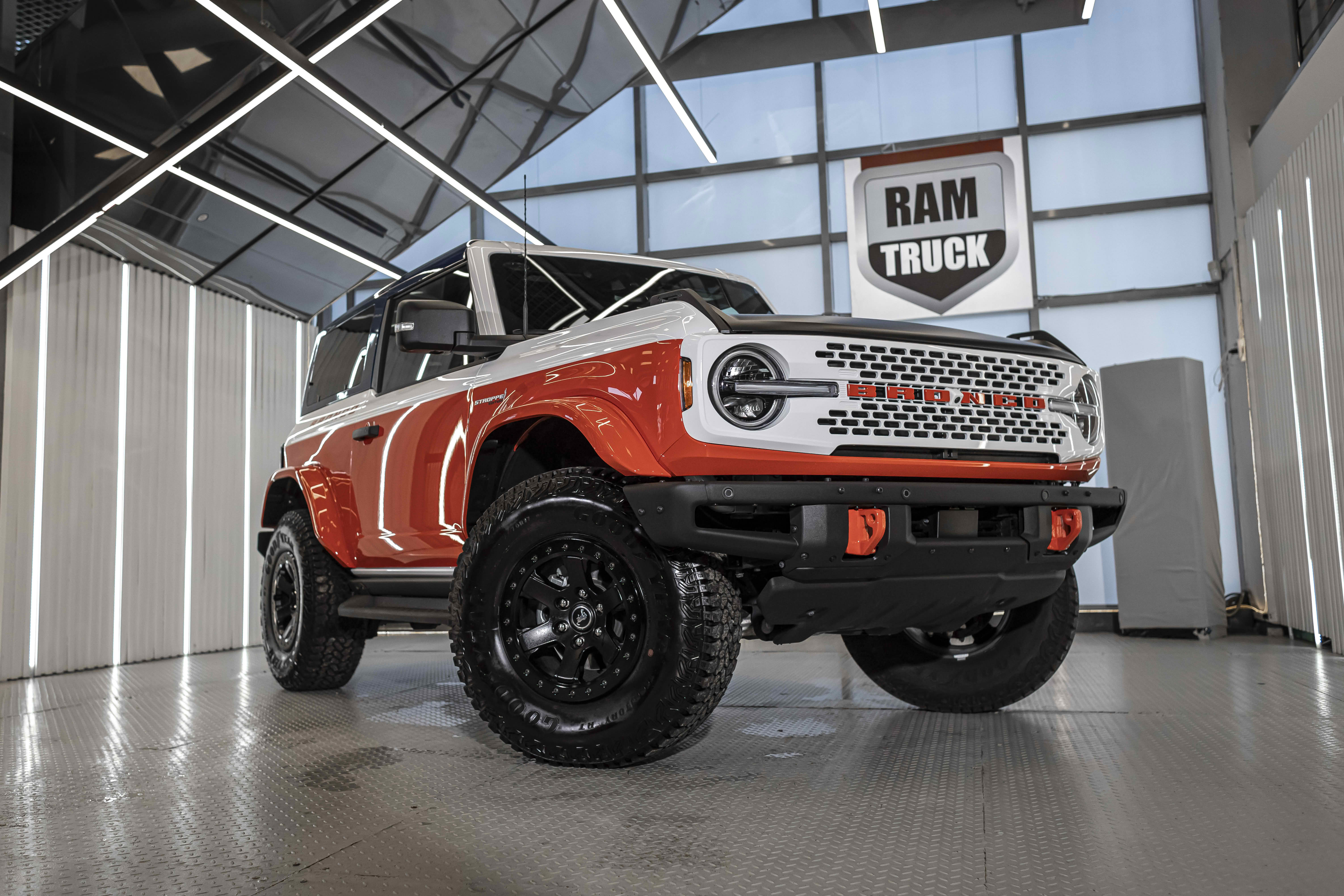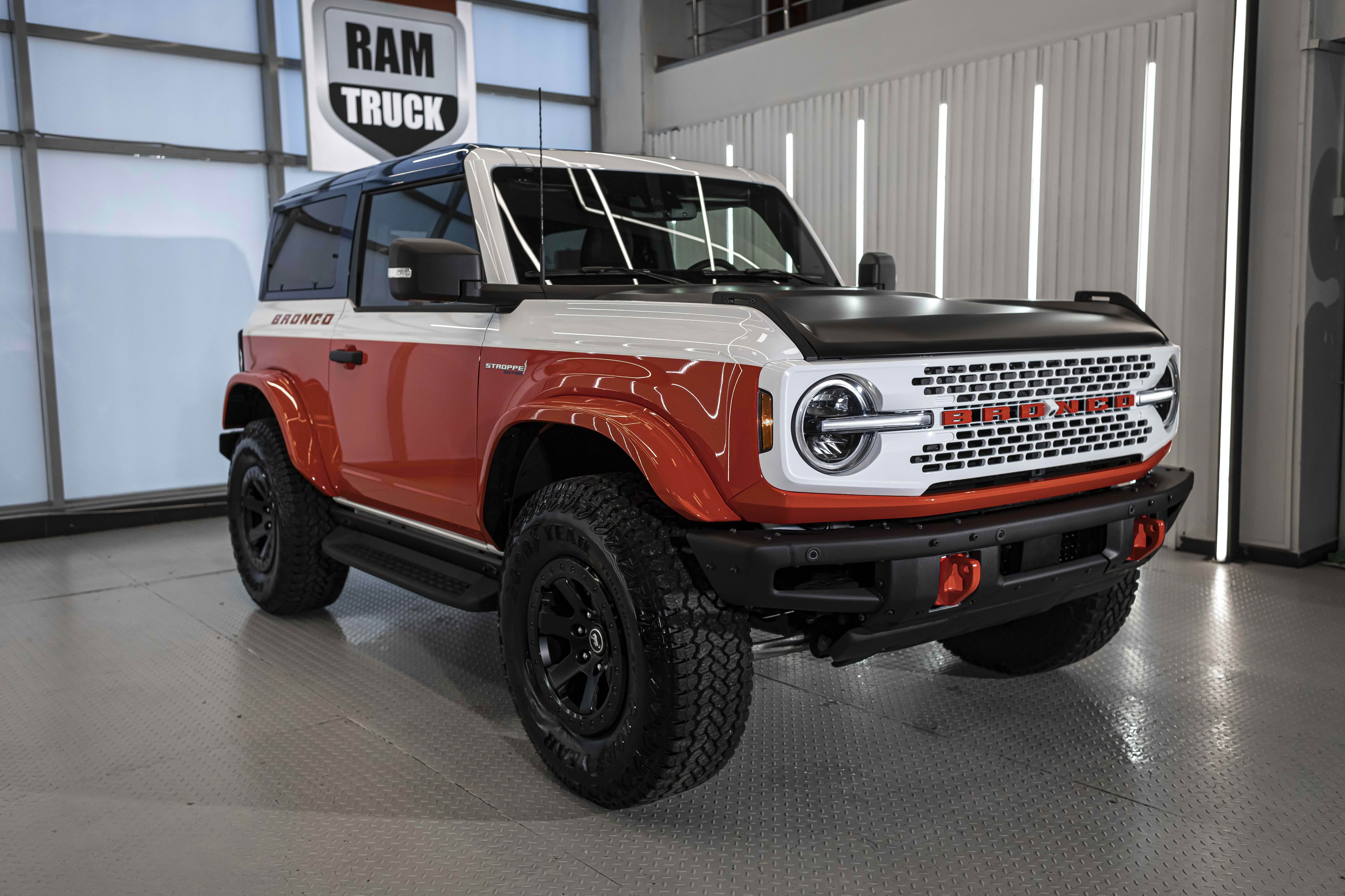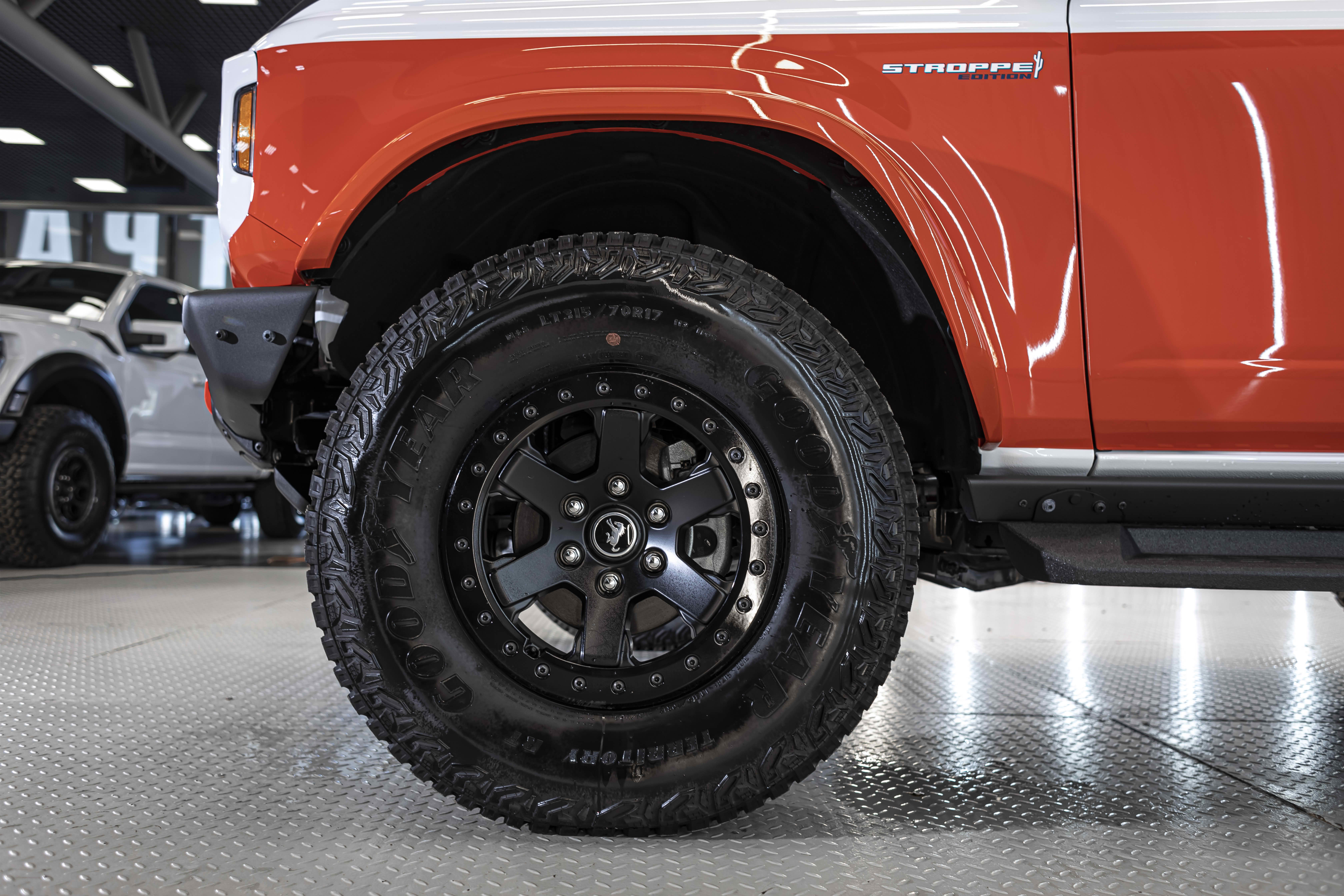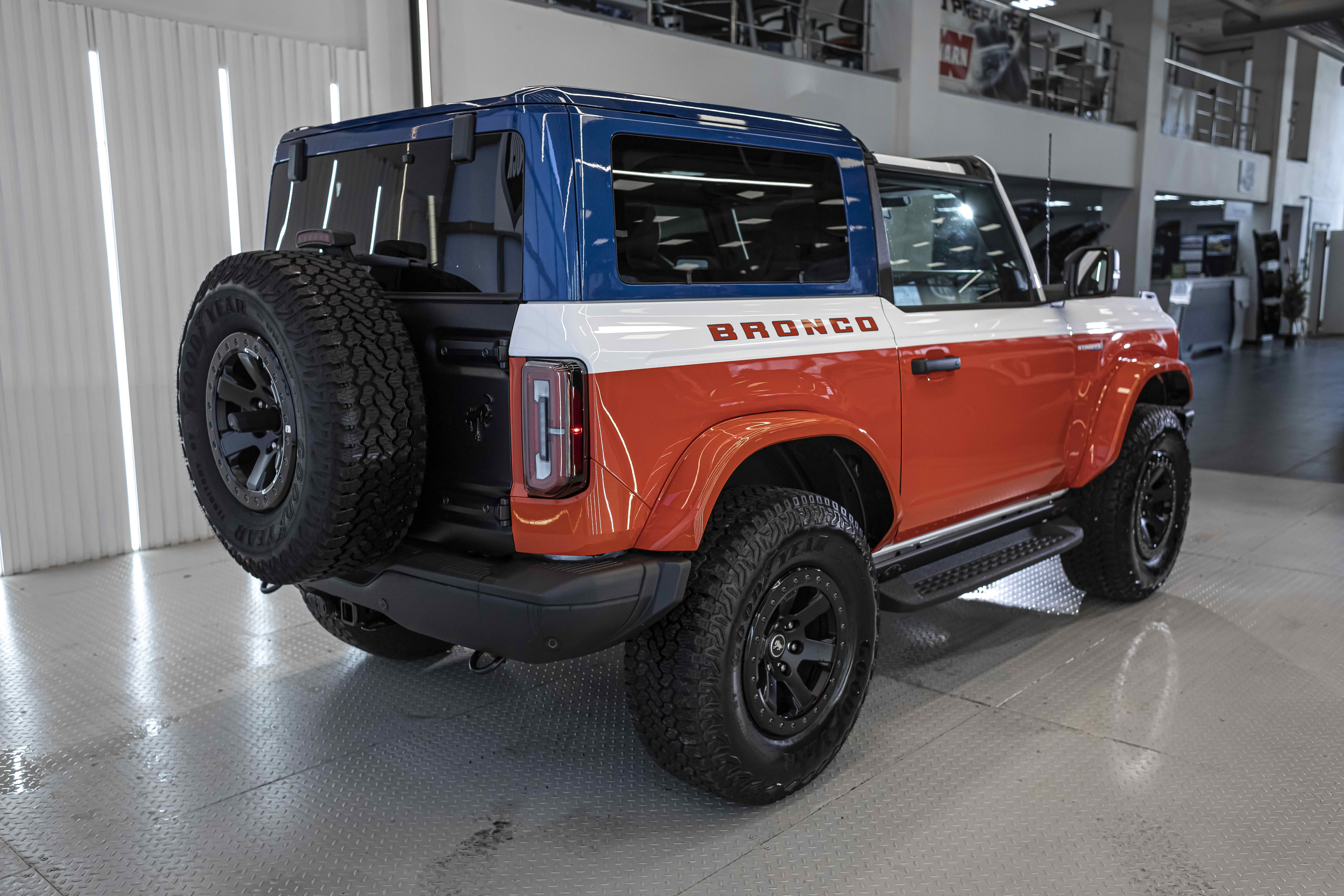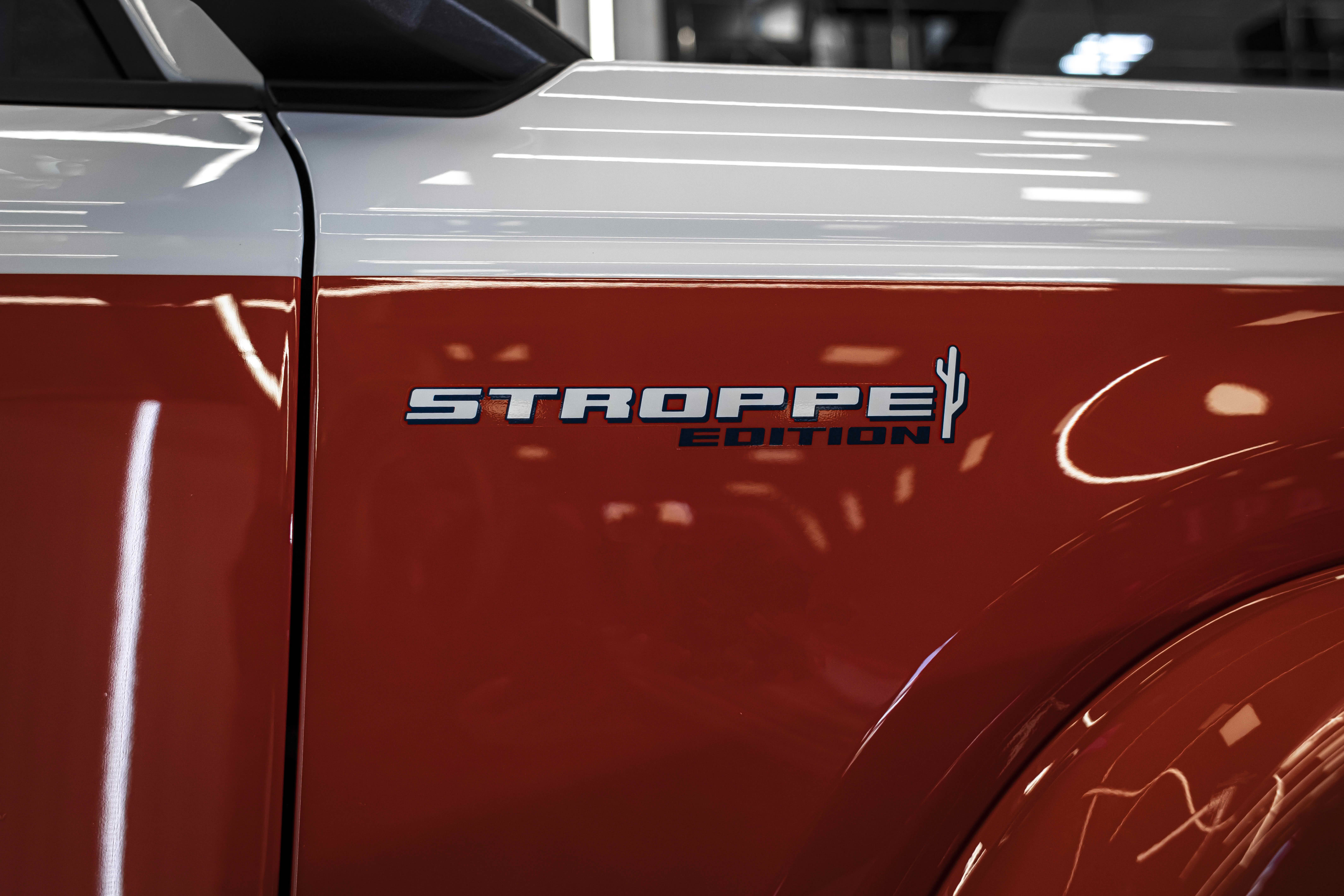 Stroppe Edition выделяется уникальной цветовой гаммой: Atlas Blue, Oxford White и эксклюзивный Code Orange, ранее доступный только для Raptor. Белая решётка радиатора с оранжевой надписью «Bronco», матово-чёрный капот и задняя дверь, стальные бамперы, оранжевые буксировочные крюки и 17-дюймовые чёрные колёса — всё это подчёркивает ретро-стиль и готовность к приключениям.