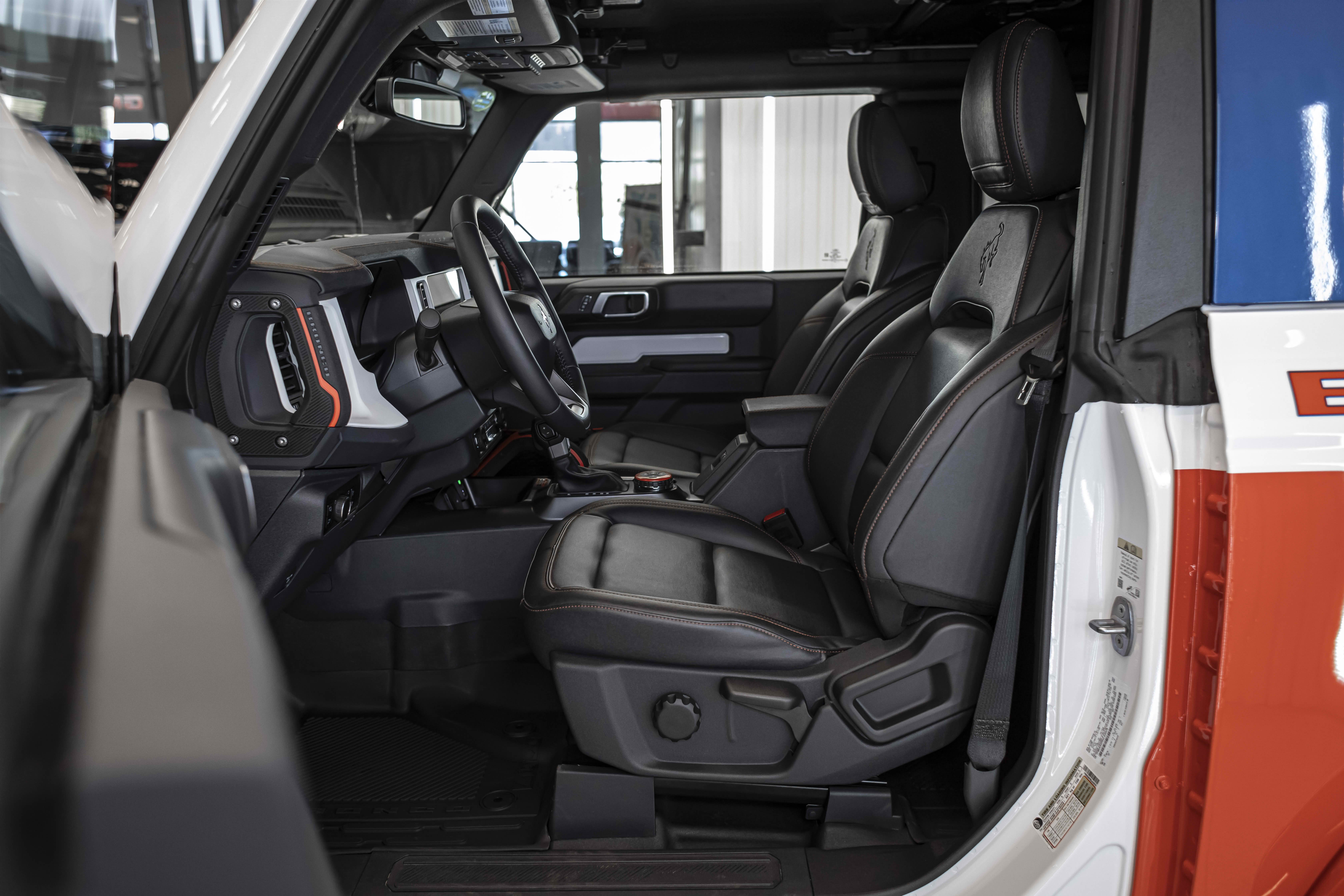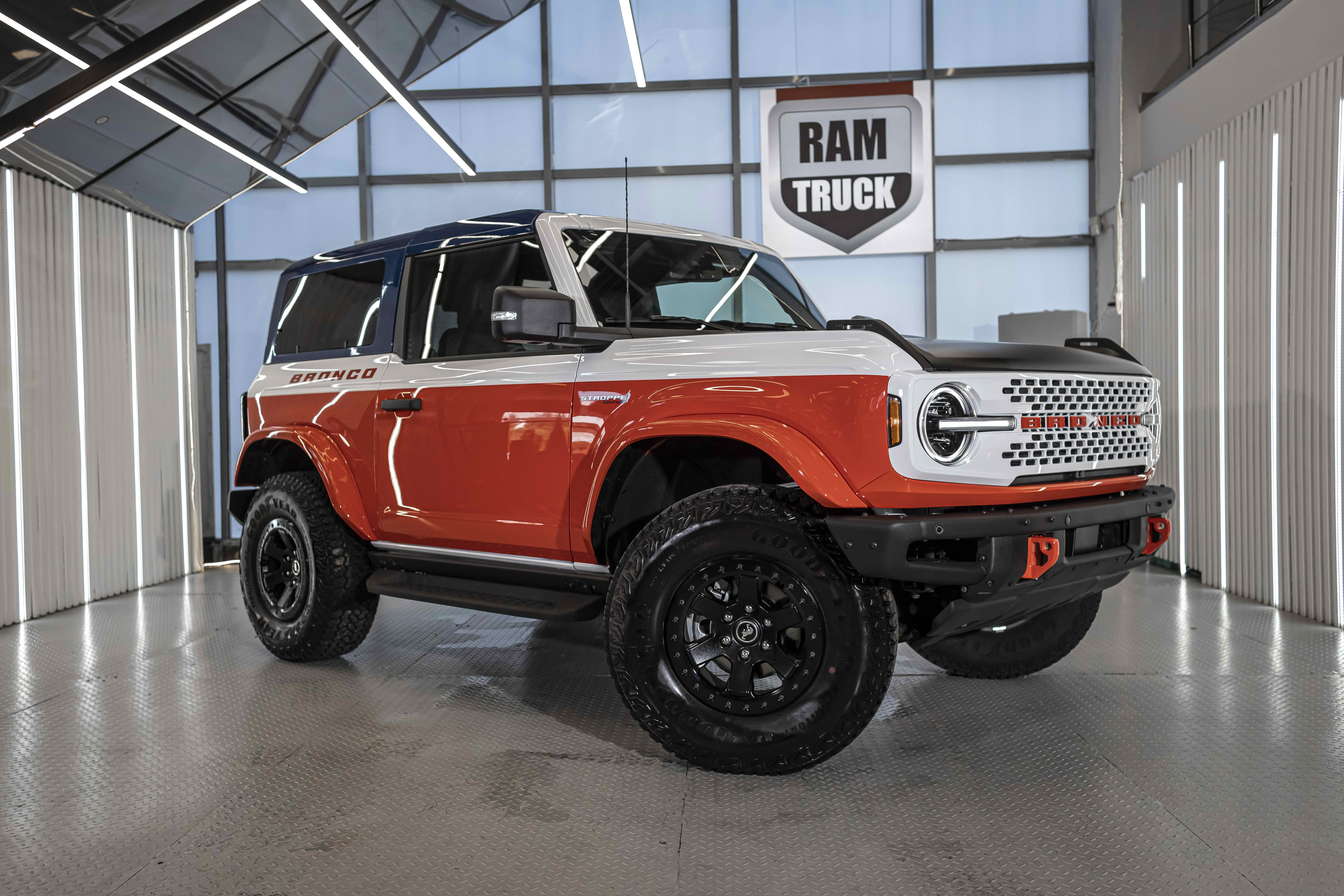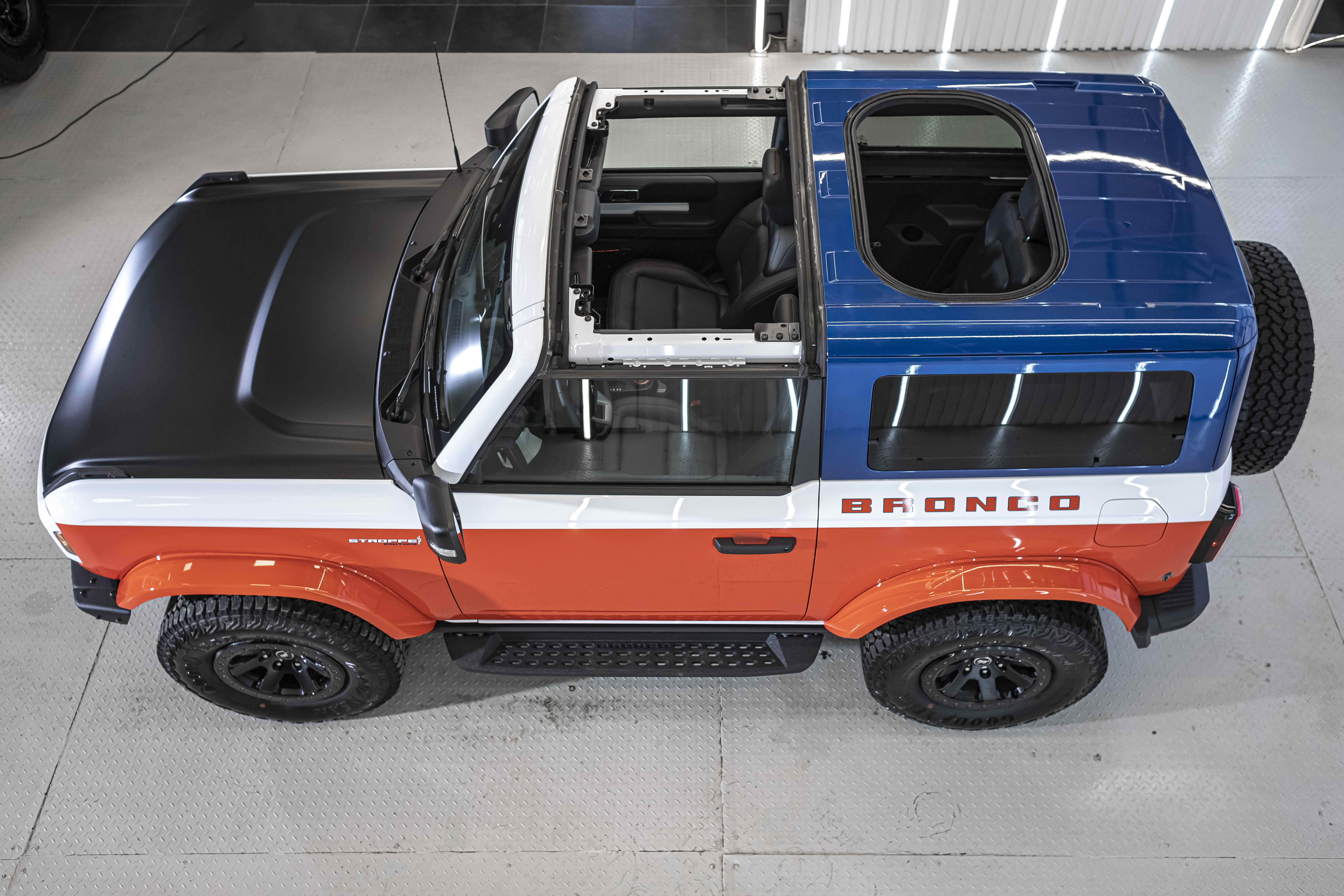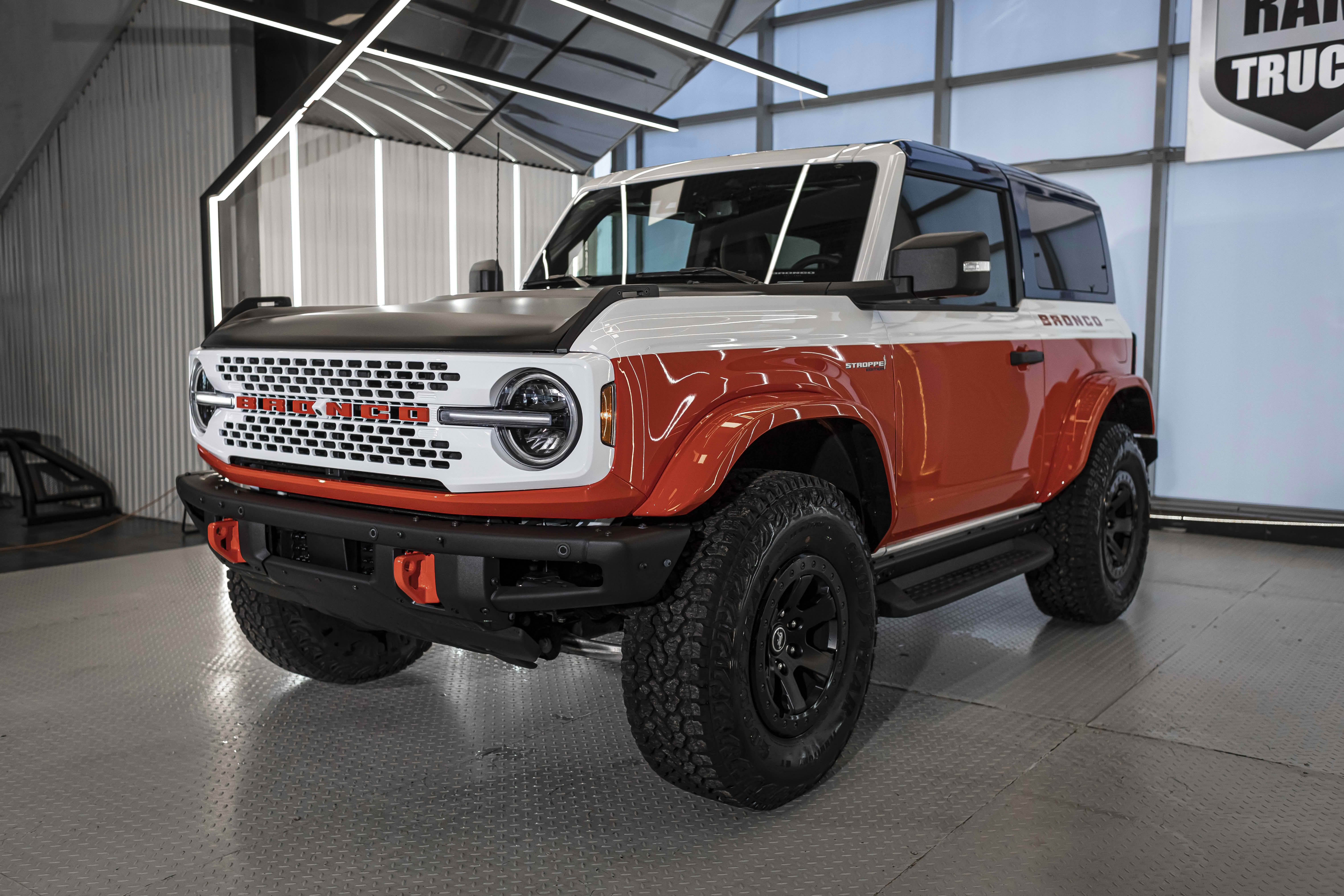 Stroppe Edition выделяется уникальной цветовой гаммой: Atlas Blue, Oxford White и эксклюзивный Code Orange, ранее доступный только для Raptor. Белая решётка радиатора с оранжевой надписью «Bronco», матово-чёрный капот и задняя дверь, стальные бамперы, оранжевые буксировочные крюки и 17-дюймовые чёрные колёса — всё это подчёркивает ретро-стиль и готовность к приключениям.