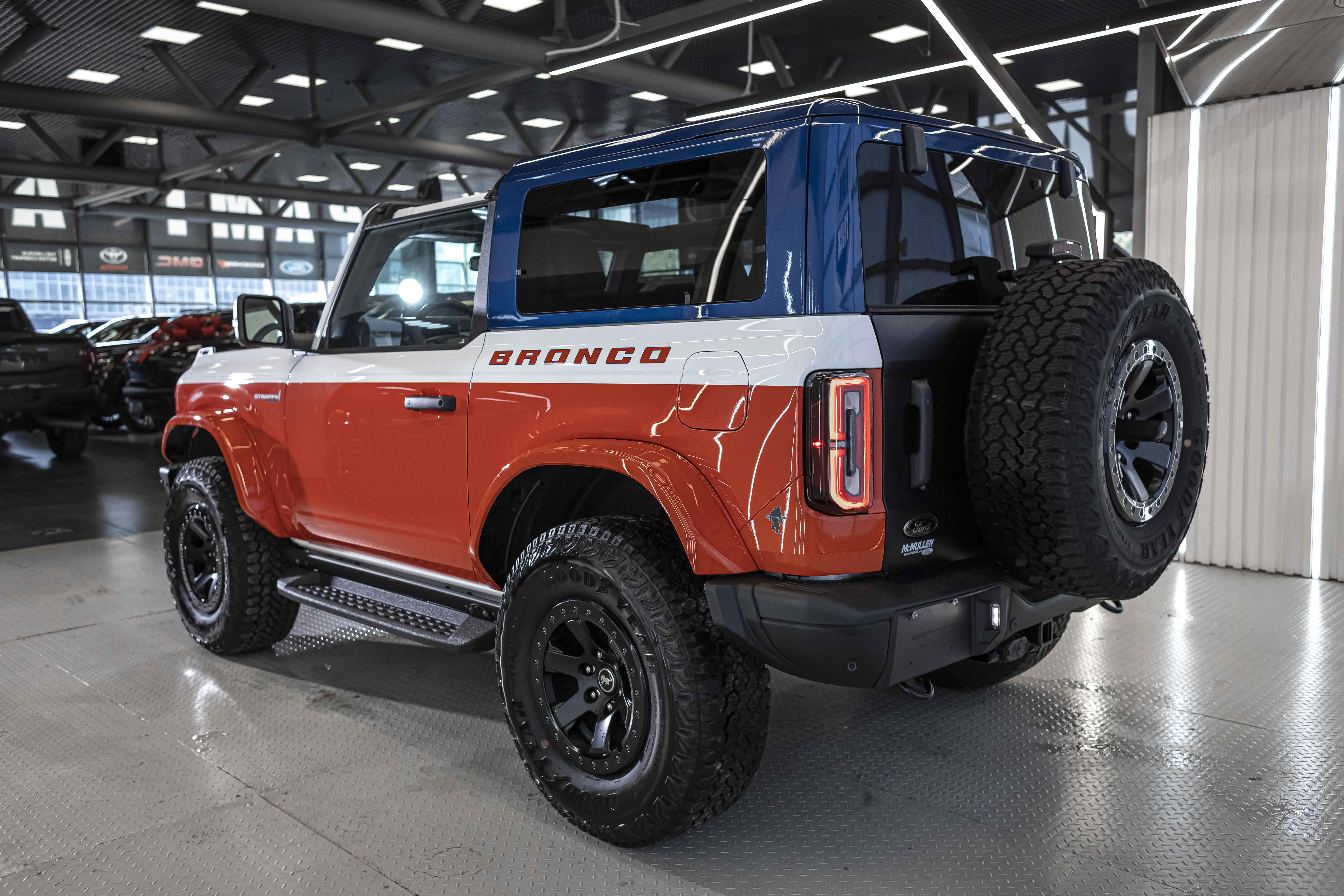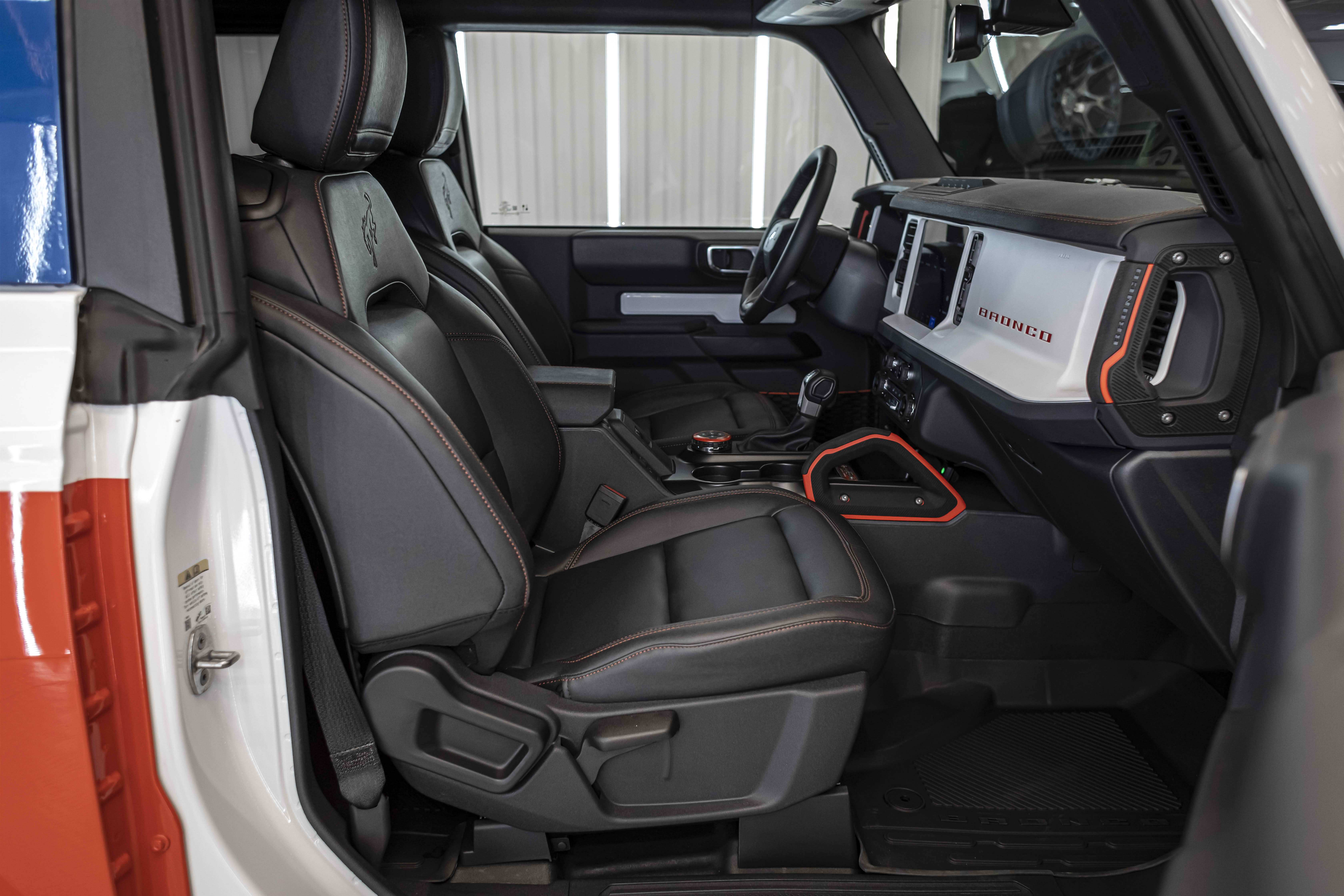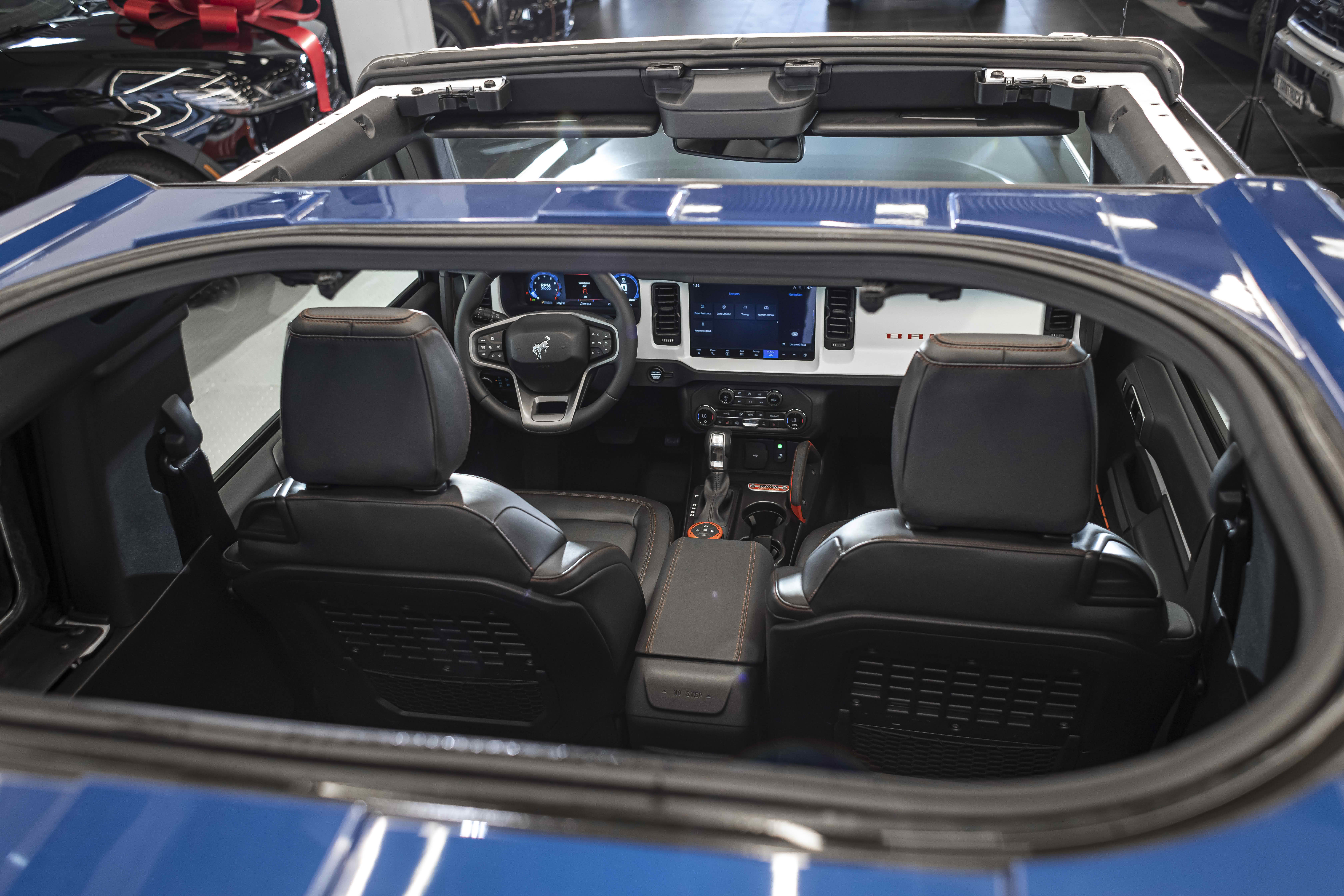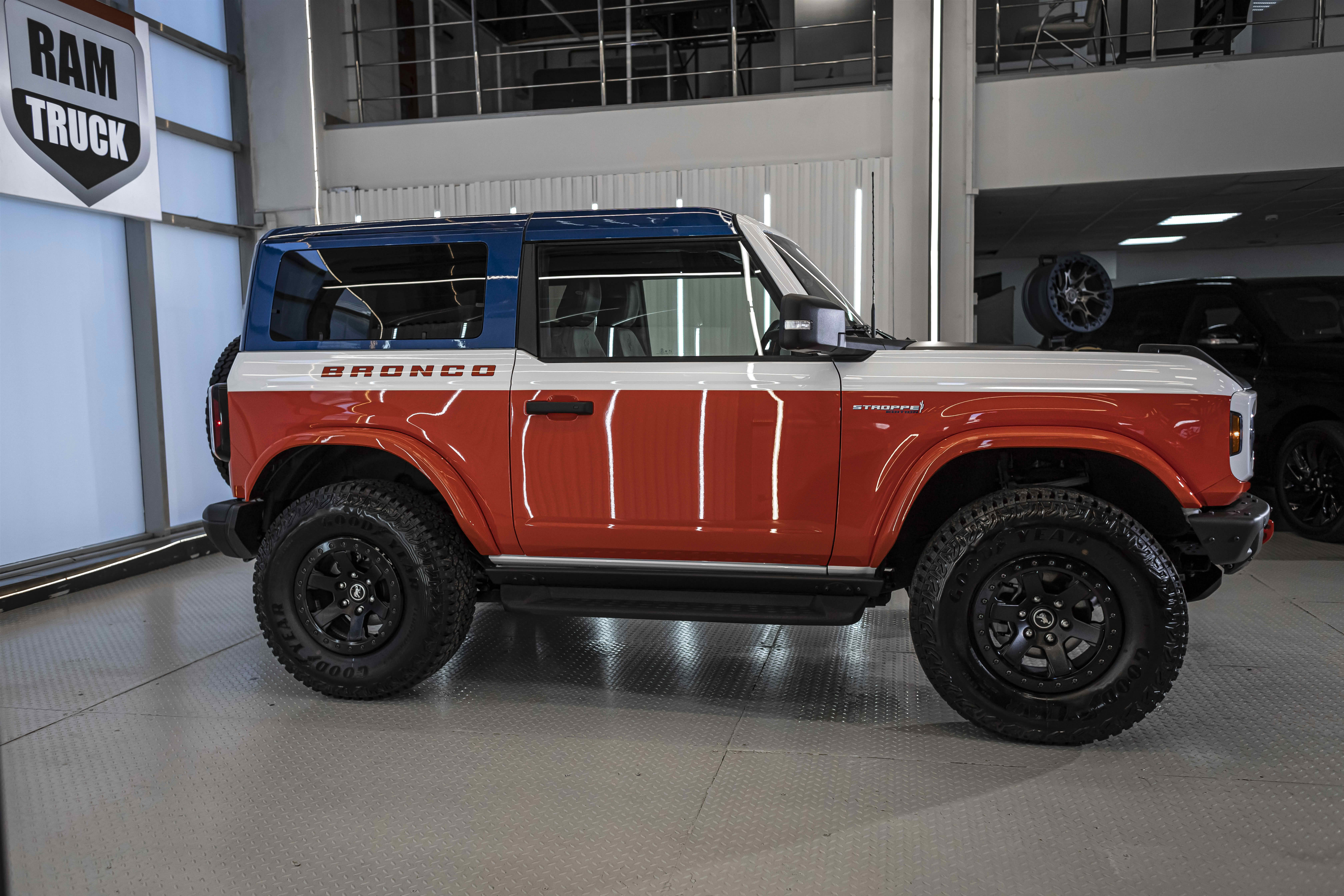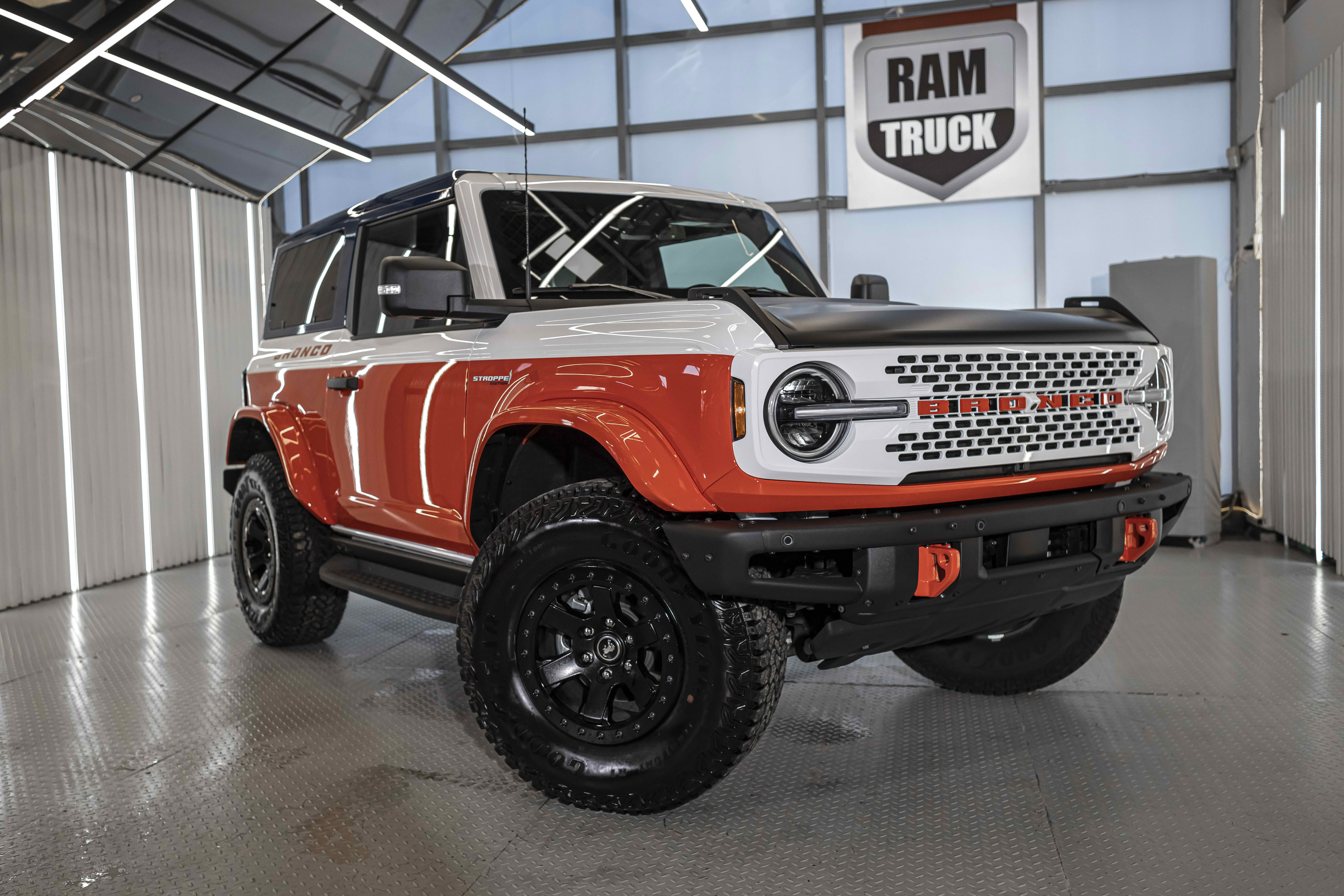 Stroppe Edition выделяется уникальной цветовой гаммой: Atlas Blue, Oxford White и эксклюзивный Code Orange, ранее доступный только для Raptor. Белая решётка радиатора с оранжевой надписью «Bronco», матово-чёрный капот и задняя дверь, стальные бамперы, оранжевые буксировочные крюки и 17-дюймовые чёрные колёса — всё это подчёркивает ретро-стиль и готовность к приключениям.