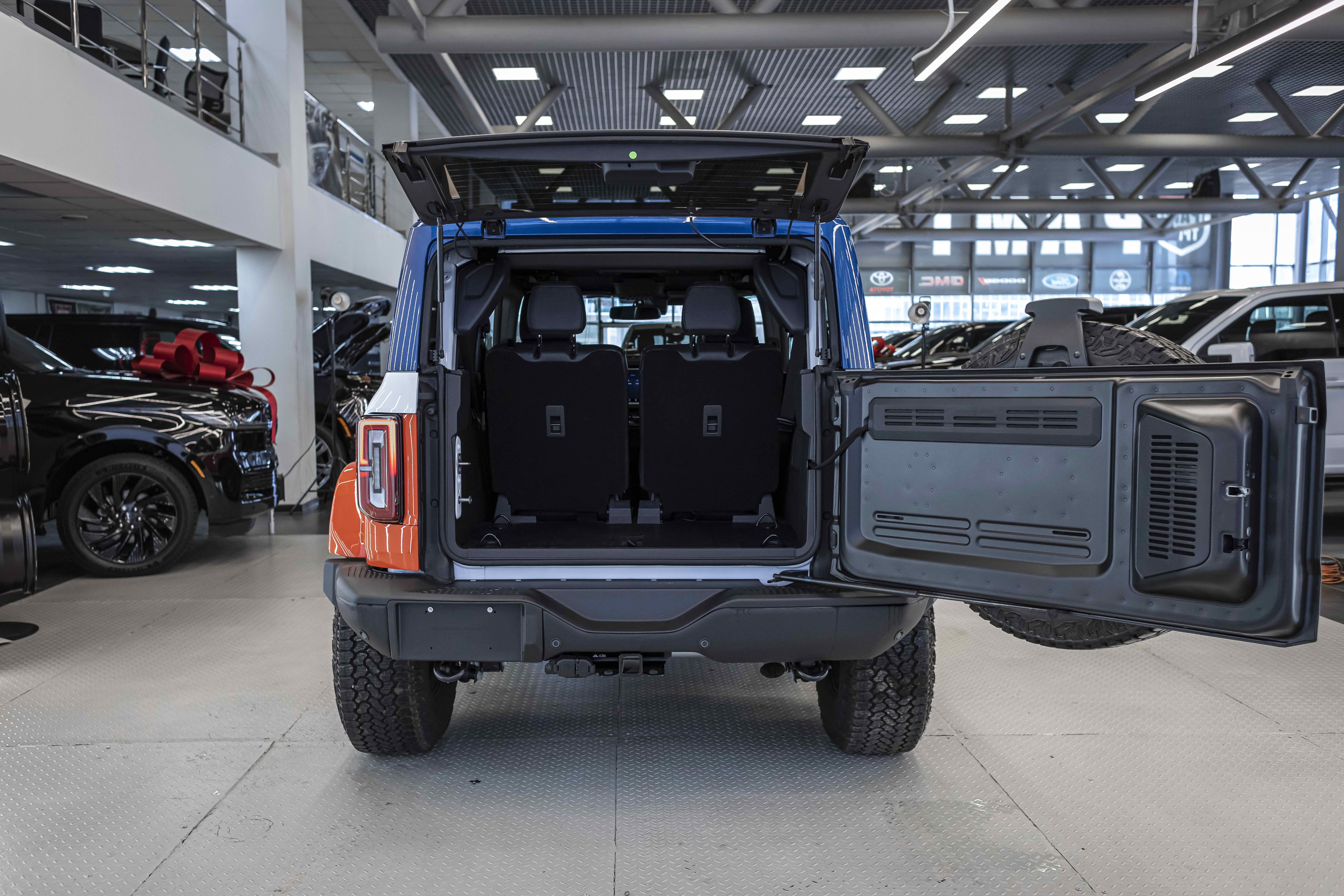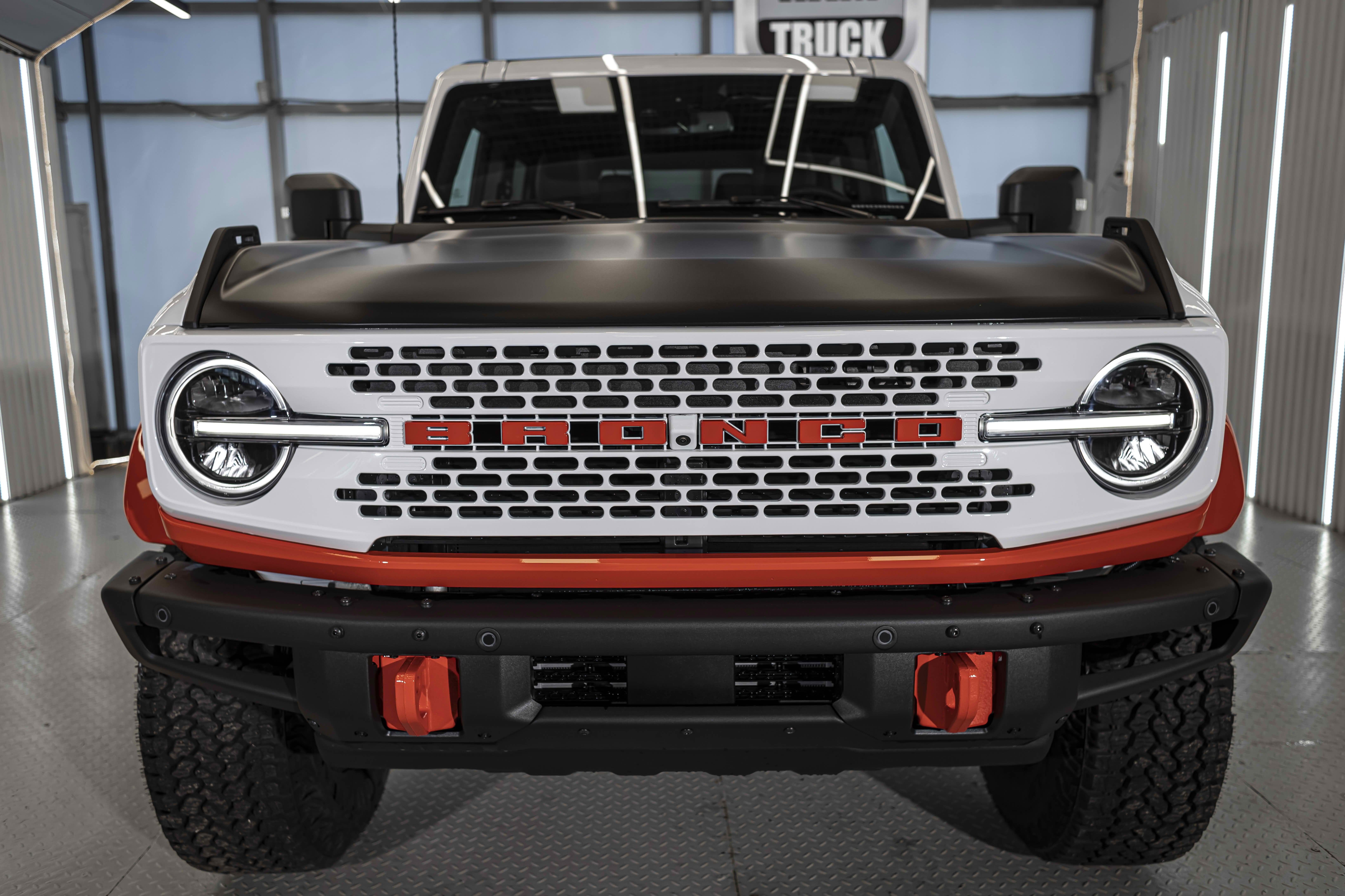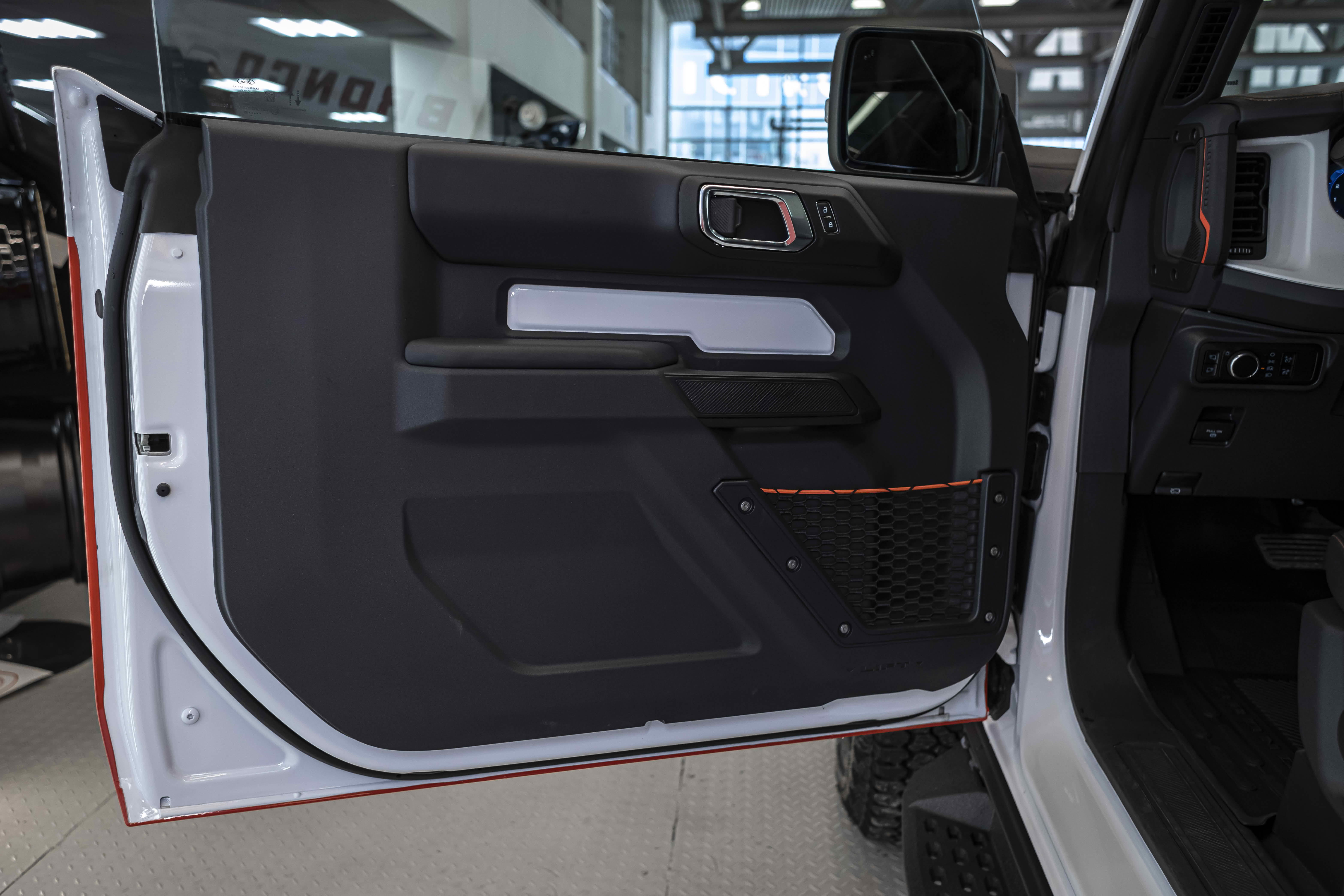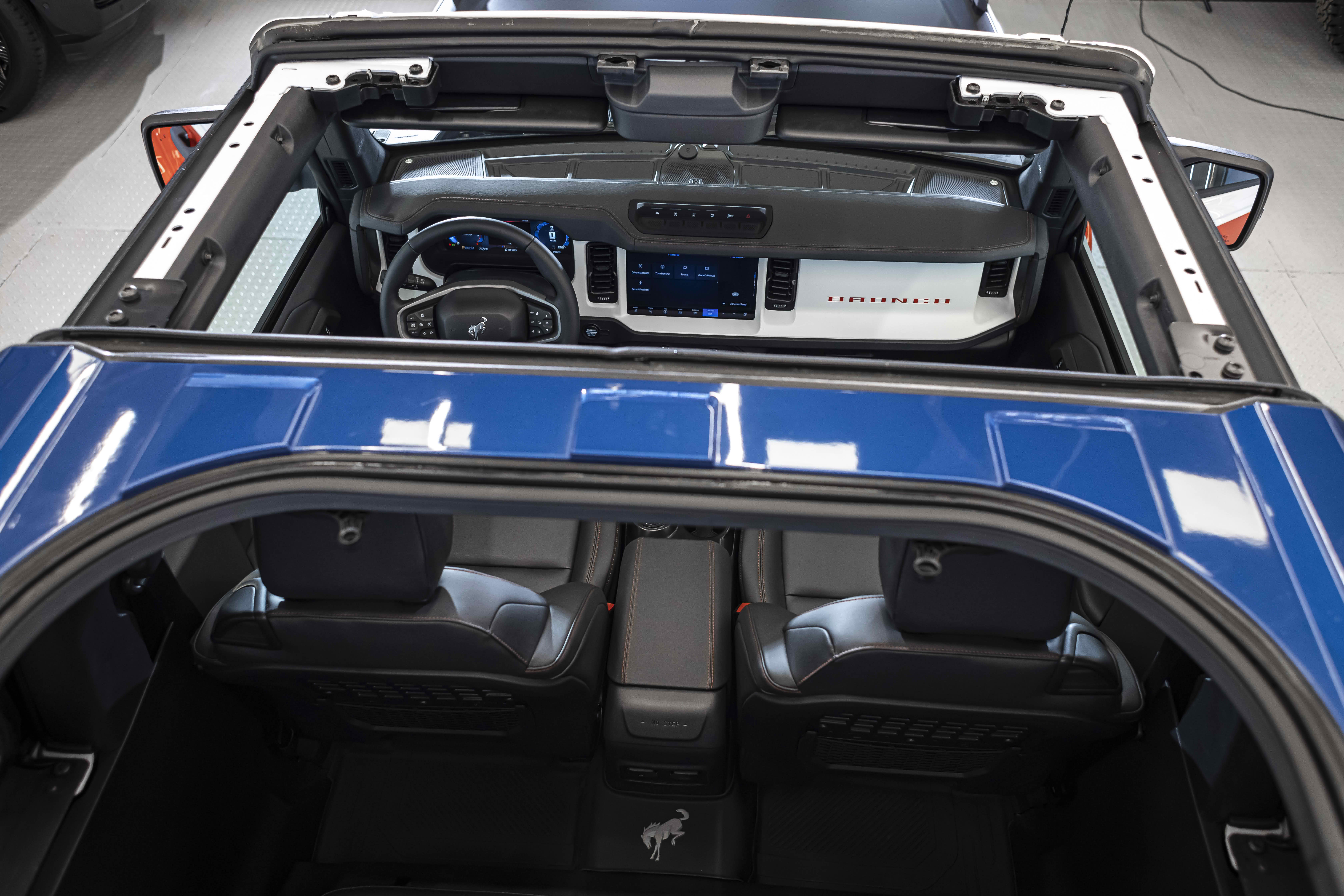 Stroppe Edition выделяется уникальной цветовой гаммой: Atlas Blue, Oxford White и эксклюзивный Code Orange, ранее доступный только для Raptor. Белая решётка радиатора с оранжевой надписью «Bronco», матово-чёрный капот и задняя дверь, стальные бамперы, оранжевые буксировочные крюки и 17-дюймовые чёрные колёса — всё это подчёркивает ретро-стиль и готовность к приключениям.