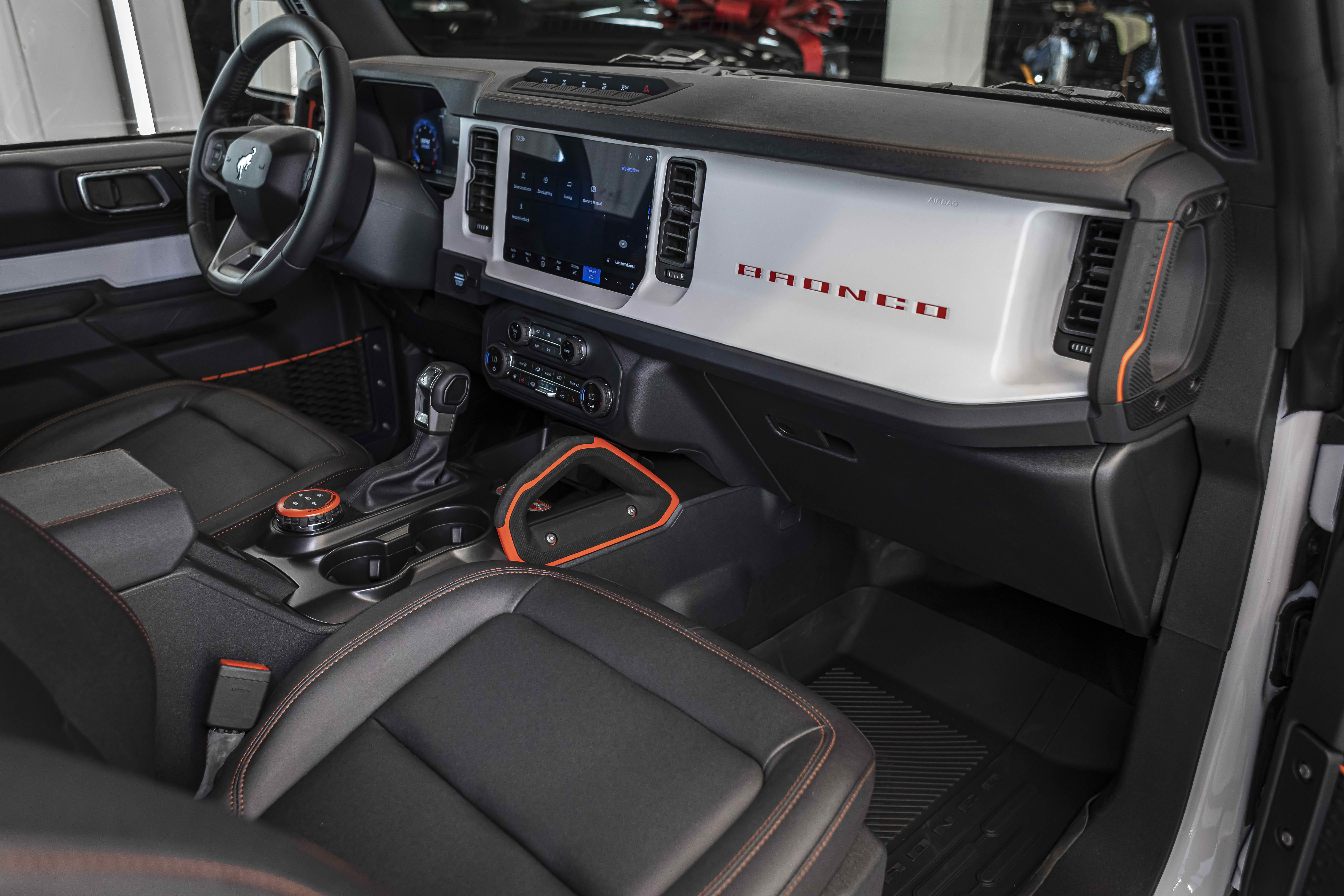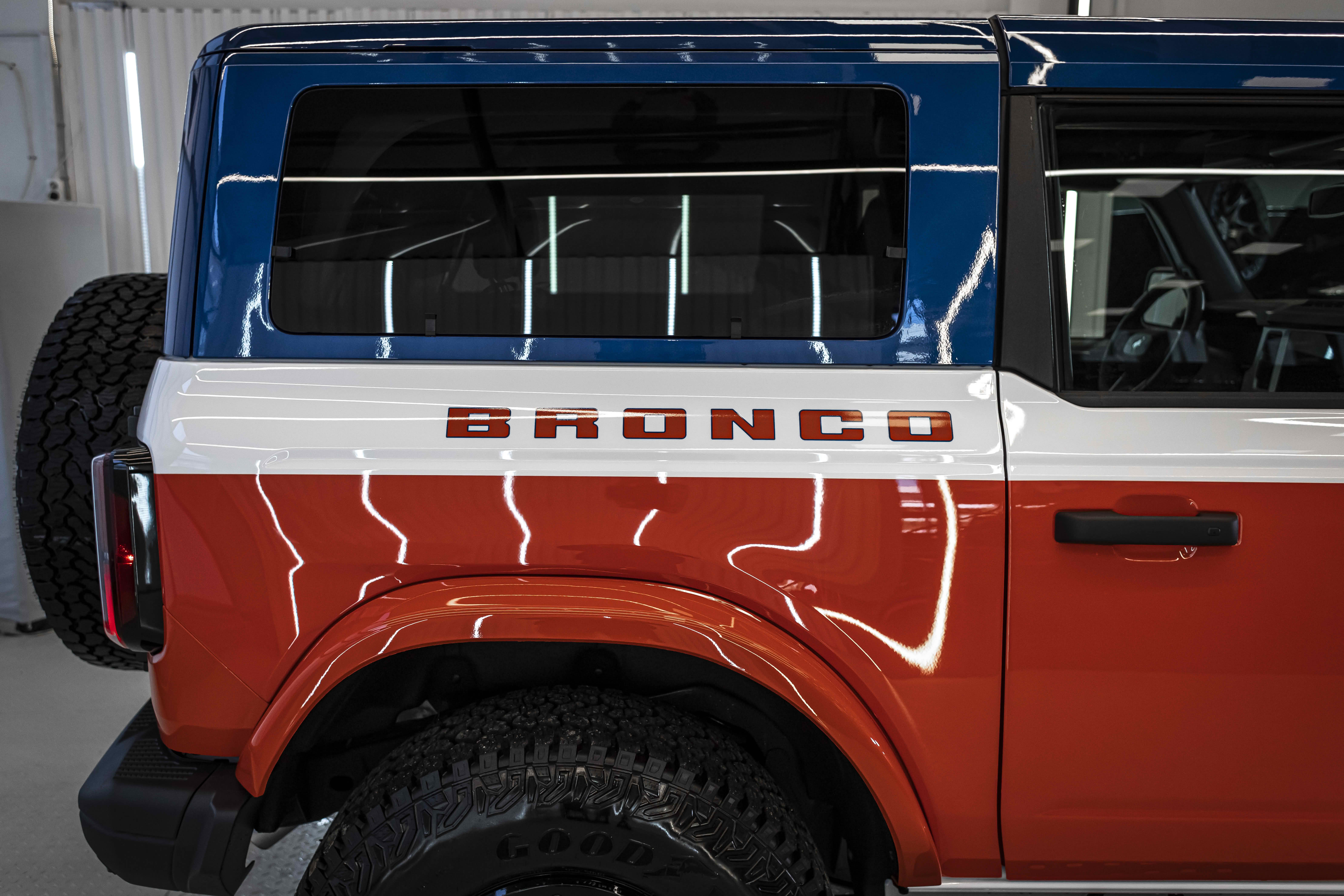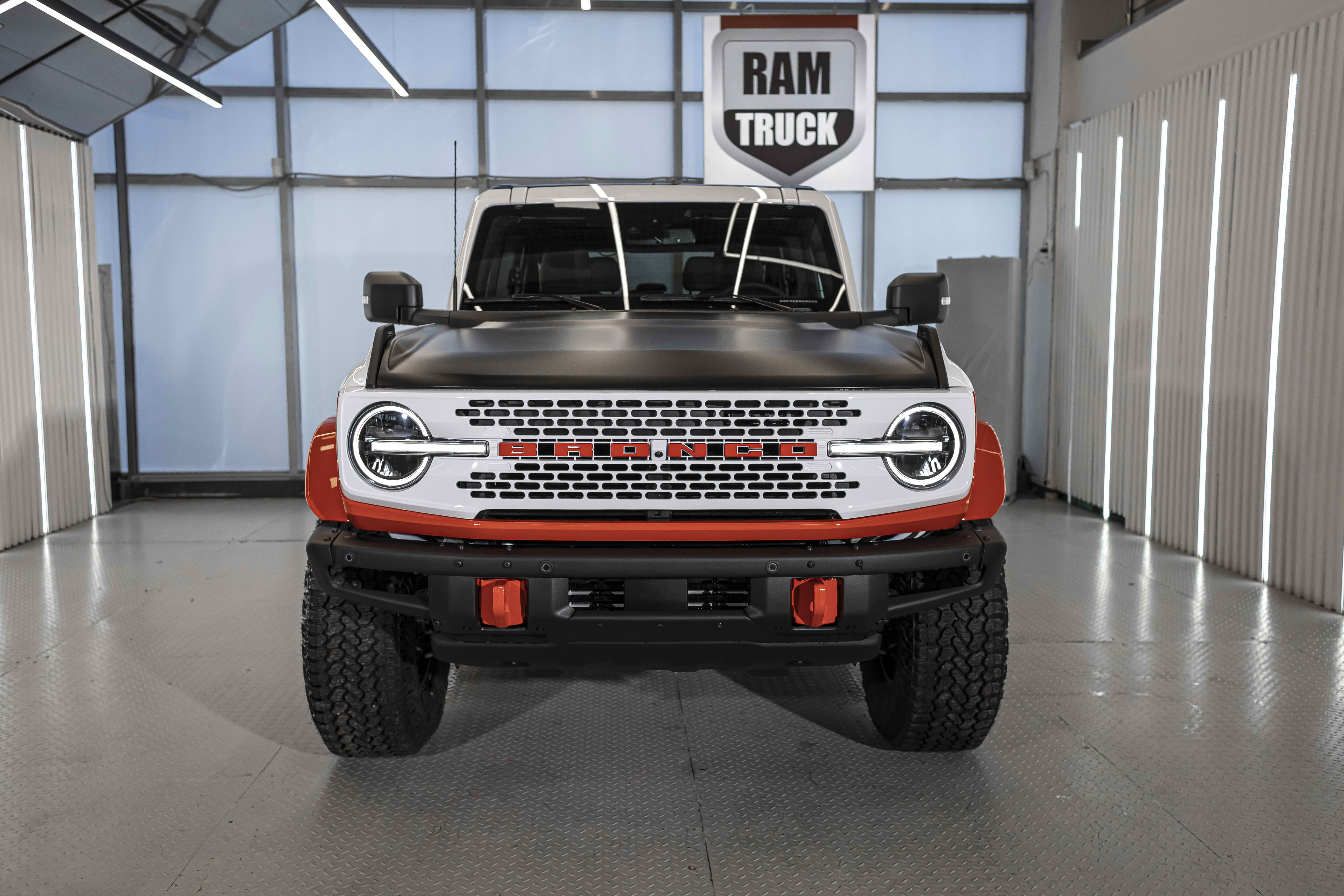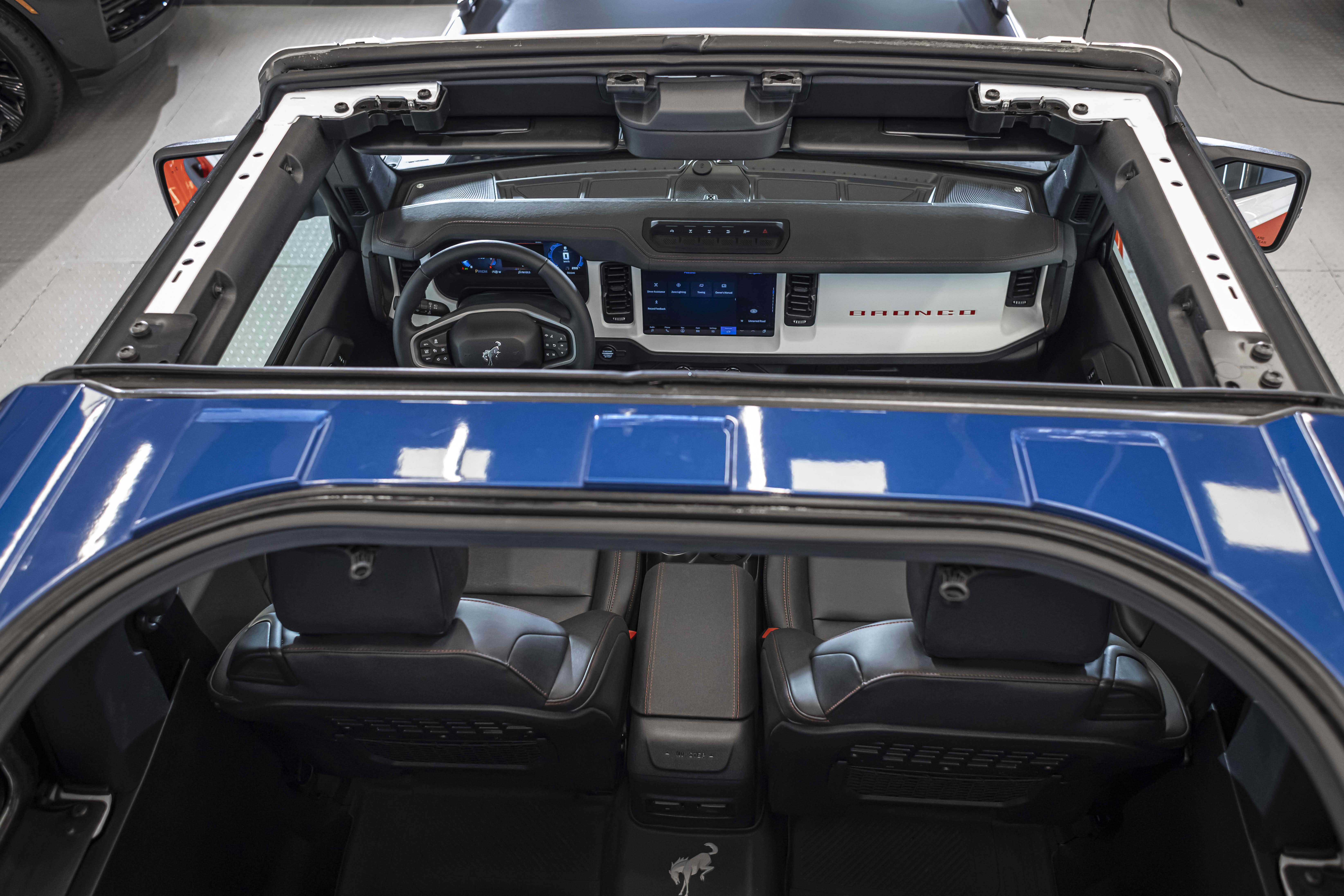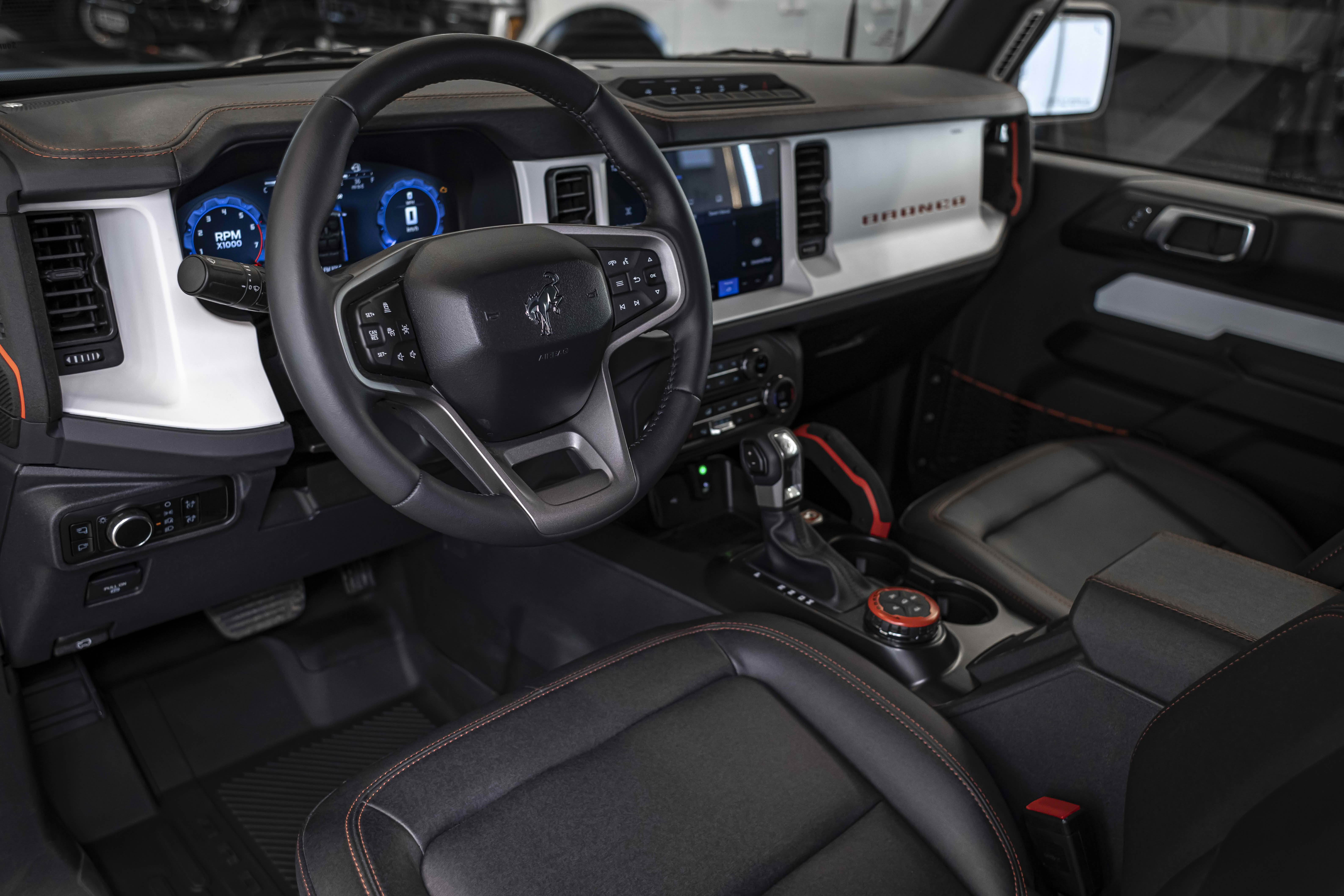 Stroppe Edition выделяется уникальной цветовой гаммой: Atlas Blue, Oxford White и эксклюзивный Code Orange, ранее доступный только для Raptor. Белая решётка радиатора с оранжевой надписью «Bronco», матово-чёрный капот и задняя дверь, стальные бамперы, оранжевые буксировочные крюки и 17-дюймовые чёрные колёса — всё это подчёркивает ретро-стиль и готовность к приключениям.