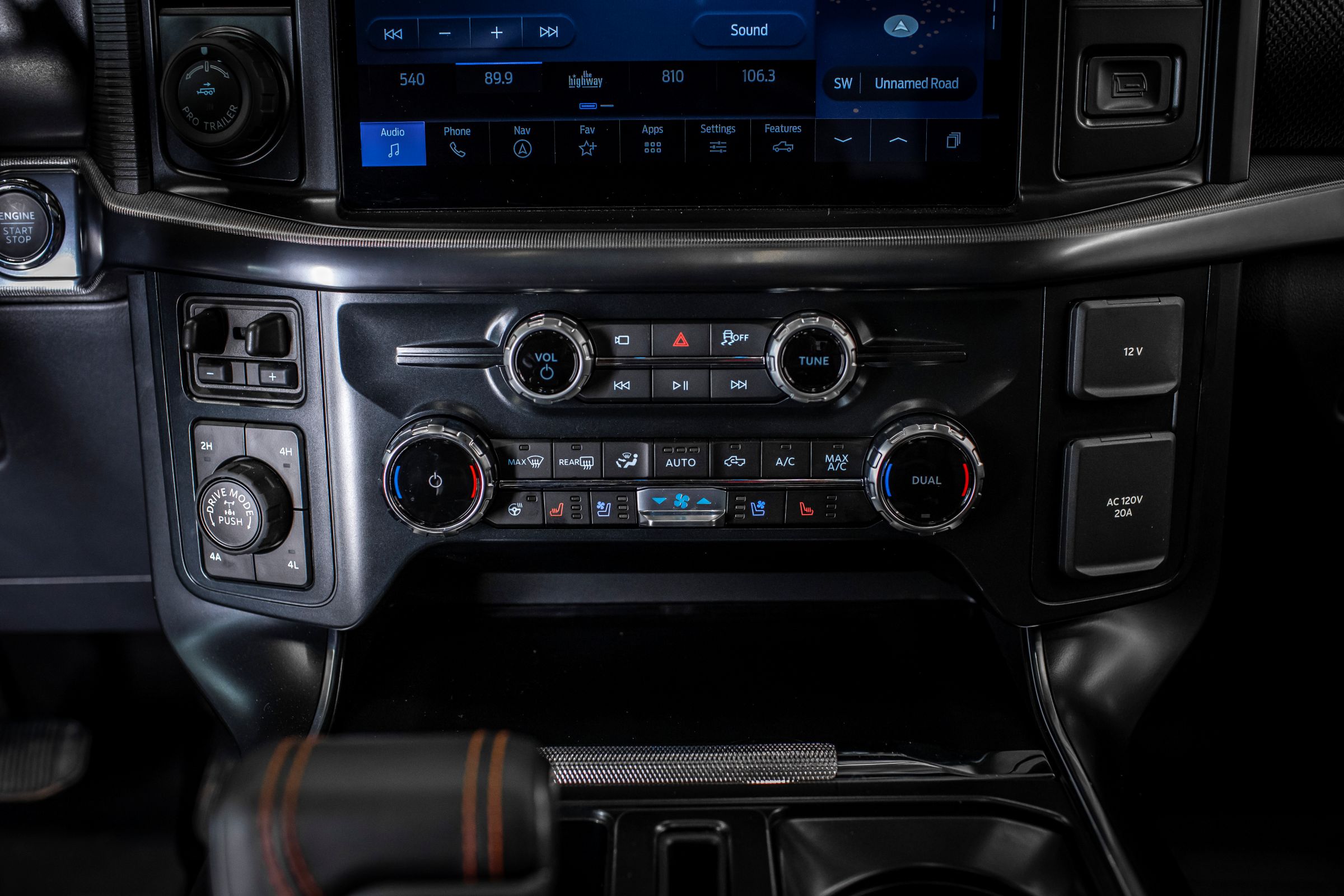 - Режимы вождения: Normal (нормальный режим), Sport (спортивный режим), Tow/Haul (режим буксировочной тяги), Slippery (режим скользкой дороги), Off-Road (внедорожный режим), Baja (режим пустынной местности), Rock Crawl (режим каменистой дороги)